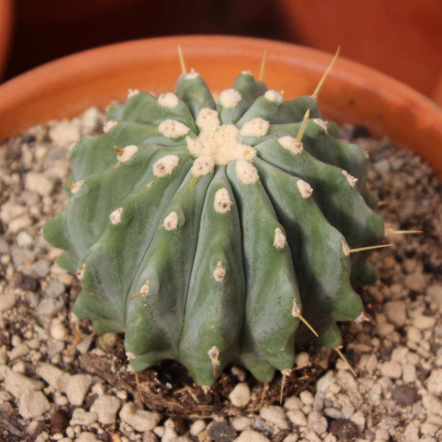 Variedad sin espinas del Ferocactus glaucescens denominada inermis, recientemente trasplantado a una maceta de barro con sustrato mayormente mineral.