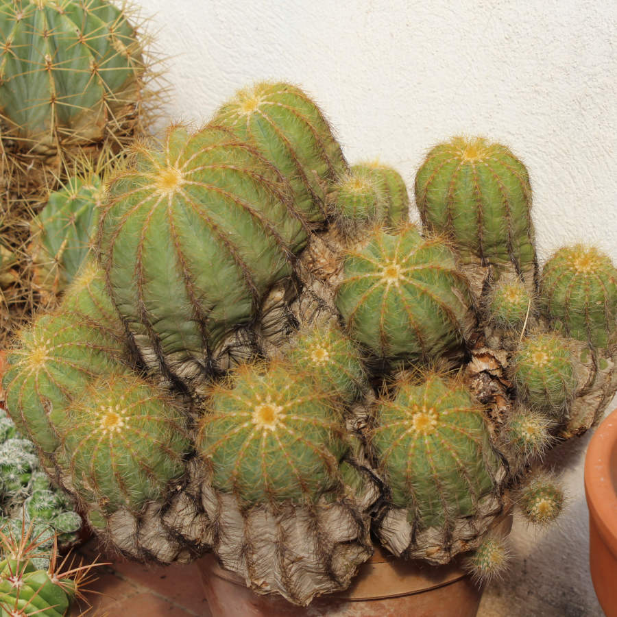 Parodia magnifica tiene las espinas doradas y produce flores grandes de color amarillo brillante. En la foto se puede apreciar un ejemplar adulto con numerosos hijuelos.